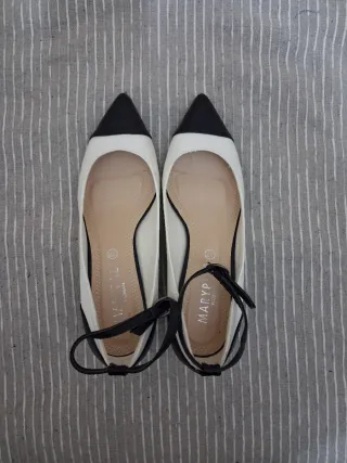 Zapatos de tacón estilo salón con diseño bicolor, una pieza elegante y clásica que nunca pasa de moda. Estilo/corte: Diseño de punta fina en color negro con cuerpo en blanco. Cuentan con una pulsera al tobillo con hebilla para mayor sujeción y un tacón tipo "kitten heel" (tacón bajo) muy cómodo para llevar todo el día. Talla: 38 Medidas aprox.: Tacón de 5 cm, largo de plantilla 24.5 cm. Estado: Muy buen estado. Se han usado en un par de ocasiones para eventos. La estructura y la suela están muy bien conservadas, sin roces significativos en la puntera. #zapatos #bicolor #taconbajo #vintage #talla38 #pumps #blackandwhite #kittenh