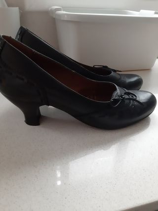zapatos talla 38, equivalente a 37 europea. de piel negra. apertura trasera y con goma elástica adicional en talón, piel tratada y flexible para mayor comodidad. marca pielsa. usados con marca de desgaste en el interior pero muy bien cuidados y sin marcas de otros desgastes. tacon minimo