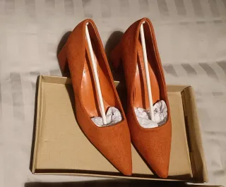 Elegantes zapatos de tacón con un llamativo color teja. - Tacón grueso y cuadrado. - Punta afilada. Sin estrenar