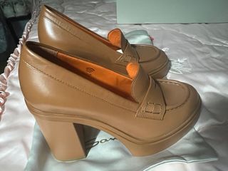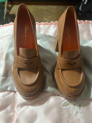 Elegantes y lujosos zapatos de tacón de la marca Santoni. - Diseño tipo mocasín. - Tacón grueso y plataforma. - Interior forrado en color naranja. - Fabricados en Milano, Italia. Completamente nuevos, sin estrenar. En caja original, fundas de tela para guardar los zapatos en su caja, para una óptima conservación. Con certificado de autentificado. Con tarjeta para inscribir en membresía, y poder ampliar garantía por 1 año más, a parte de la que ya tiene. Color camel, con interior del calzado en naranja.