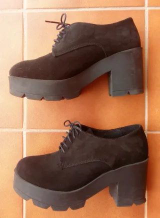 Zapatos negros de ante con cordones y tacón. Suela gruesa y robusta. Muy cómodos. Talla 39. Impecables, usados solamente un par de veces.