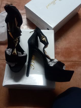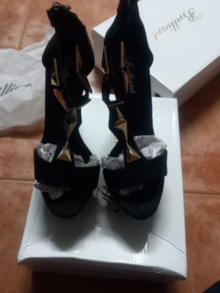 23 pares de elegantes zapatos de tacón con plataforma y detalles dorados. - Diseño abierto. - Adornos metálicos en forma de estrella. - Cierre de cremallera en el talón. Tallas desde 36 a 40 Si te los llevas todos los pares, te los dejo en 5 euros cada par.