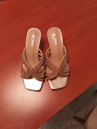 Elegantes zapatos de tacón para mujer con un diseño único. - Acabado en color dorado. - Tira delantera adornada con pedrería. - Tacón metálico con forma.moderna sin estrenar totalmente nuevo de la venta me lo probé y me queda pequeños solo pido 5 euros ,repito nunca a pisado suelo no es negociable