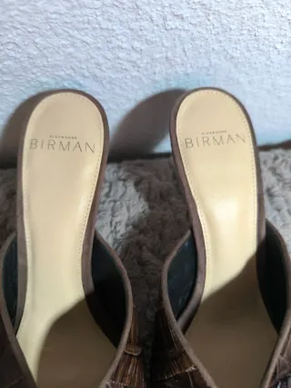 Elegantes mules de Alexandre Birman con un diseño de tacón destalonado. -Sin estrenar, nunca se han usado en calle -Exterior, interior y suela de piel - Tiene defecto, al intentar limpiar la suela para la venta, al ser de cuero ha quedado manchada -Su precio era 525,00 eur - Acabado texturizado que imita piel de cocodrilo. - Punta afilada. - Suela de cuero natural con ligero tono irregular por limpieza previa a la venta (propio del material). Estado impecable.