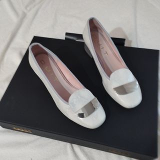 Elegantes zapatos con un diseño moderno. en tono gris perla y blanco. Hechos en España, flexibles y con suela de goma. sin usar. Son preciosos - Acabado texturizado en blanco y detalles plateados. - Adorno metálico en la palta. - Interior forrado en color rosa pálido. - Suela con un discreto tacón.