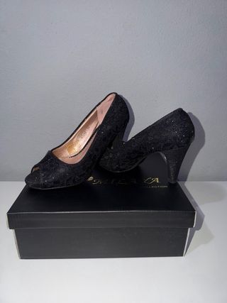 Zapatos de fiesta NUEVOS A ESTRENAR de color negro. En la puntera hace un dibujo en forma de rejilla. El tacón es color negro brillante. De aprox. 9,5 cm. Talla 38. Marca "Pilar Burgos". Precio en tiendas 49.90 euros. Elegantes zapatos de tacón fino, perfectos para ocasiones especiales. Material exterior de ante. Diseño con tiras transparentes y lazo. Tacón alto y fino. ✅️WALLAPOP TODO PARA NIÑ@S Y BEBÉS EN MI OTRO PERFIL. PREGÚNTAME SIN COMPROMISO✅️