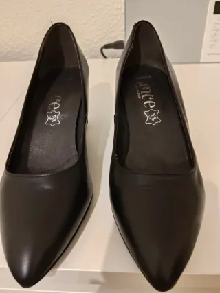 Zapatos Unisa talla 37 en piel negra con tacón bajo fino. Modelo elegante de punta afilada, ideal para oficina, eventos o looks formales. Tacón cómodo para llevar todo el día sin perder estilo. Suela con relieve antideslizante. Están en muy buen estado, con leves señales normales de uso en la piel y en la plantilla, visibles en fotos. Sin roturas ni daños estructurales. Marca de calidad a precio ajustado para venta rápida.