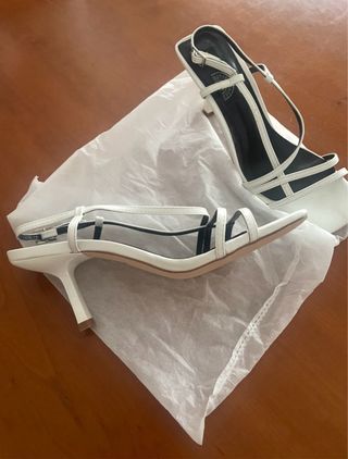 Elegantes zapatos de tacón con diseño slingback. - Tacón fino. - Correa ajustable con hebilla. - Punta fina. Tengo el bolso que se uso en la ceremonia Solo usado durante la cerenonia