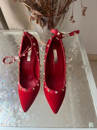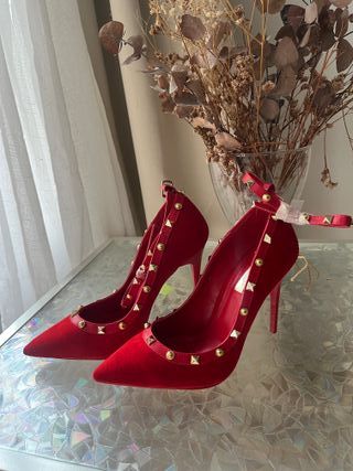 Preciosos stilettos en acabado velvet/terciopelo color rojo intenso, con detalles de tachuelas doradas estilo rockstud que les dan un toque elegante y sofisticado. Diseño en punta fina y pulsera al tobillo para mayor sujeción y estilizar la pierna. - Estado: Nuevos, sin uso - Talla: 38 - Color: Rojo - Material exterior: Terciopelo (velvet) - Detalles: Tachuelas doradas + cierre con hebilla - Tacón alto fino (stiletto)