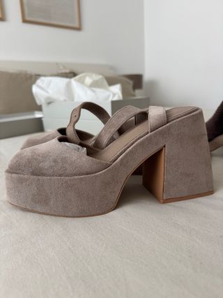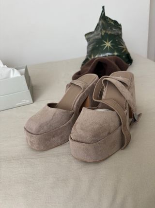 Elegantes zapatos de tacón con plataforma y tira al tobillo. - Diseño peep-toe. - Material de ante. - Tacón de aguja.tengo más cosas interesantes en mi perfil hago envío por wallapop o recogida en persona cualquier duda puede consultar sin compromiso suelo responder pronto.si compra muchas cosas de mi perfil les descuento preguntar sin compromiso.