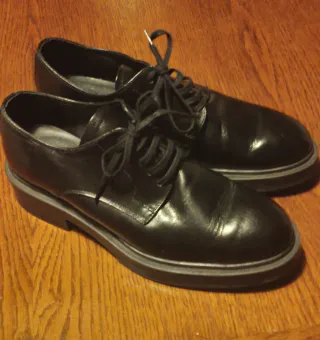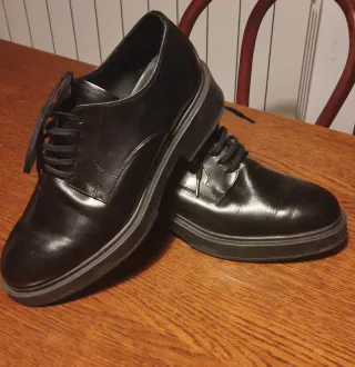 Elegantes zapatos negros con cordones. Núm 36 de Fama Pastor. - Diseño tipo Oxford. - Acabado brillante y detalles texturizados. - Suela gruesa con ribete decorativo.