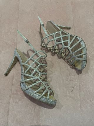 Preciosos zapatos de tacón. Son de color plata y tienen un tejido brillante. Ideales para una ocasión especial. - Tacón fino. - Cierre de hebilla. - Diseño elegante.