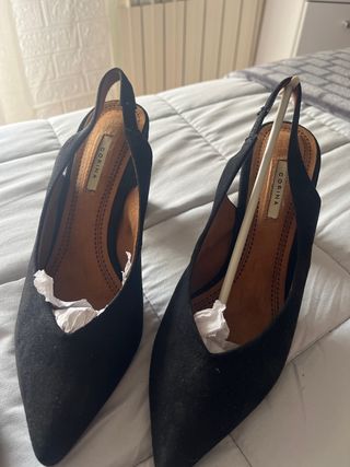 Elegantes zapatos negros con diseño de tira al talón. Nuevos sin estrenar con etiqueta. Tiene un roce tal y como se ve en la foto que es insignificante. - Material exterior: sintético. - Diseño de punta cuadrada. - Tira ajustable con hebilla dorada.