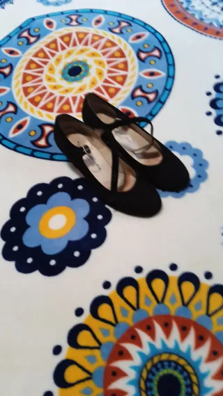 Zapatos artesanales para baile latino o de salón. - Diseño abierto en la punta. - Tira de sujeción al tobillo. - Tacón con protector. precio de compra 140 en tienda talla 37-38