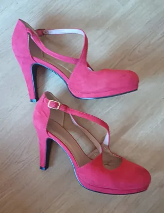 Zapatos de tacón en color rojo, con un diseño de plataforma. - Material exterior tipo ante. - Tira cruzada en el empeine con cierre de hebilla. - Tacón grueso y estable.