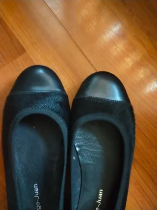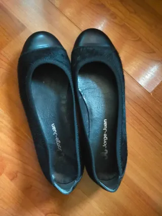 Zapatos de tacón negros de piel, con banda elastica en el empeine. Son comodos de poner y quitar y de llevar, pero tienen tacón alto. Marca Abril, hechos en España y de calidad. Me los he puesto dos veces, para conferencias, pero no son mi estilo y no los uso. Estan como nuevos, en su caja original