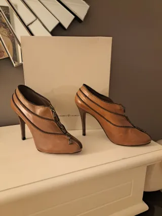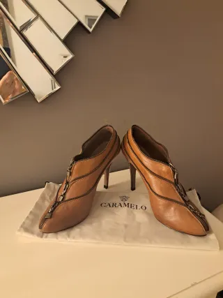 Zapatos-Botines de mujer color coñac, marca "Caramelo" con un diseño moderno y original. Apenas usado y con su caja y bolsa para viaje. - Exterior 100% vacuno. - Forro 100% caprino. - Suela 100% vacuno.
