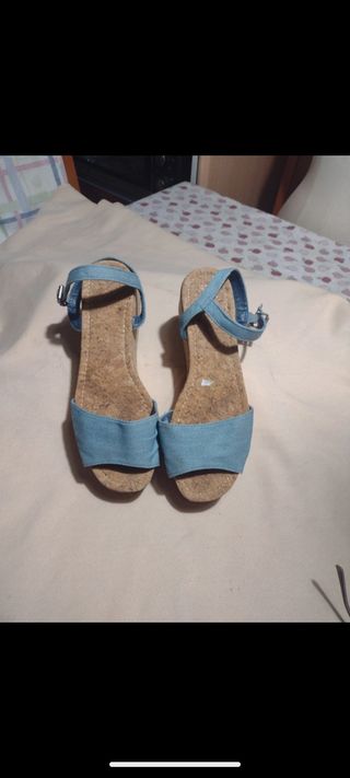 Sandalias de cuña color azul, en buen estado. - Hechas de lona. - Suela de corcho. - Cierre de hebilla. - Son dos pares.