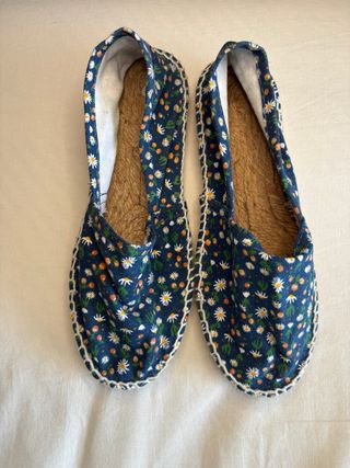 Esparteñas con estampado floral sobre fondo azul. El motivo de la venta es porque no les he dado uso desde que las compré. - Suela plana y cómoda. - Acabado con pespunte blanco. - Suela de esparto.