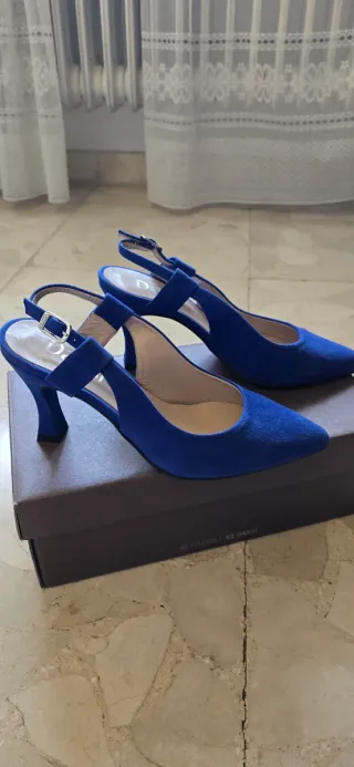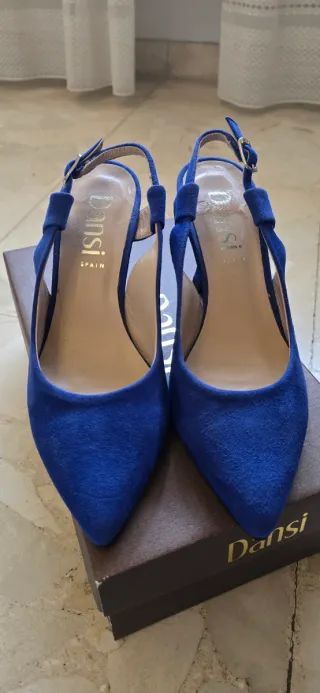Elegantes zapatos de tacón de la marca Dansi. - Color azul klein vibrante. - Diseño de tira al talón con hebilla. - Material ante. - Poco uso.