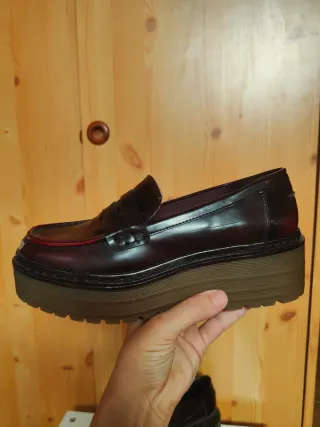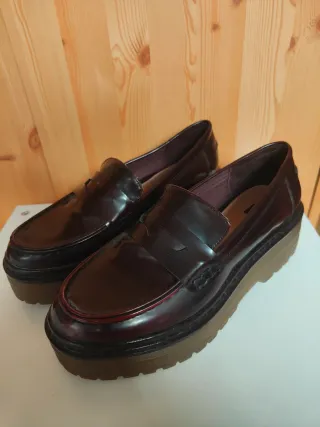 Zapatos de plataforma estilo mocasín en color marrón. Tienen un diseño moderno y llamativo. - Acabado brillante. - Suela gruesa de plataforma. - Detalle de pespuntes.