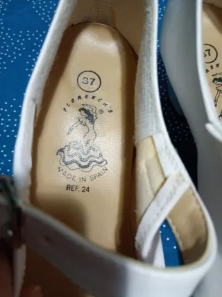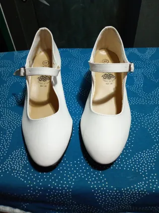 Zapatos de baile estilo sevillana. - Color blanco. - Talla 37. - Cierre con hebilla. - Detalle de logo en la plantilla. - Fabricados en España.
