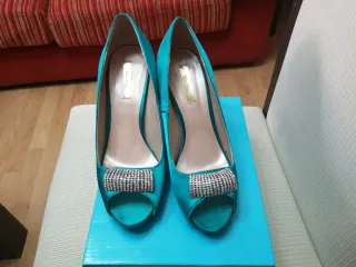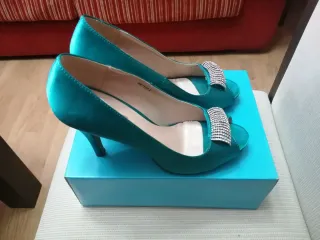 Elegantes zapatos de raso en color verde azulado, perfectos para ocasiones especiales. Cuentan con un detalle de pedrería en la puntera. Zapatos 12€ Bolso 10€ - Material: Raso - Adorno: Pedrería - Diseño: Peep-toe