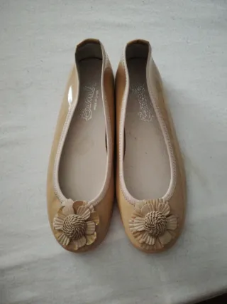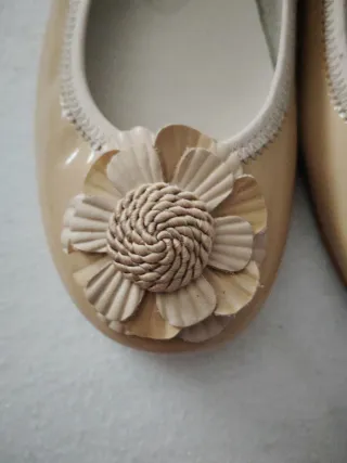 Elegantes zapatos planos en color beige. Presentan un detalle de flor en la punta. - Diseño plano. - Adorno de flor. - Material sintético brillante. Nuevas, usadas una vez