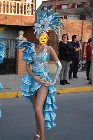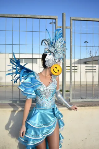Disfraz confeccionado a mano, con un diseño llamativo y lleno de detalles. TALLA S/M - Tocado con plumas y pedrería - Corsete adornado con pedrería y abalorios - Falda con volantes y capas. - Incluye guante largo, zapatos adornados(37/38) y resto de accesorios