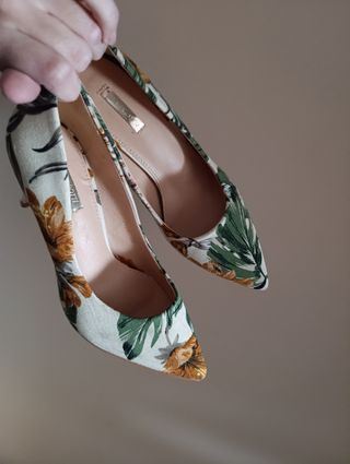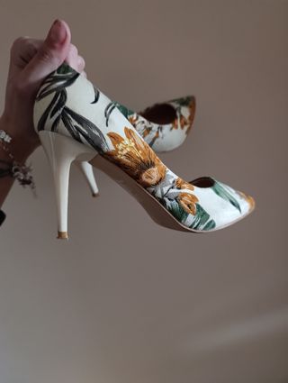 Elegantes zapatos de tacón con un llamativo estampado floral. - Diseño de punta fina. - Estampado con flores y hojas verdes y marrones. - Tacón de aguja.