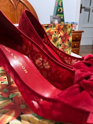 Elegantes zapatos de tacón de Sacha London en color rojo. - Diseño de encaje floral. - Detalle de lazo de terciopelo. - Tacón alto.