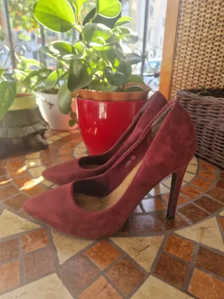 Elegantes zapatos de tacón burdeos. - Material de ante. - Diseño de punta fina. - Tacón alto y estilizado.