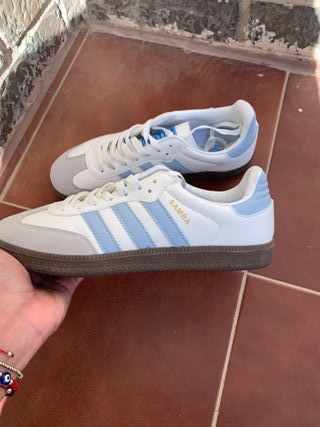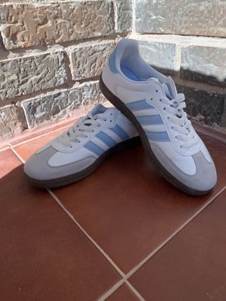 Zapatos Adidas Samba en color blanco y azul. - Diseño clásico. - Detalles de las tres franjas.