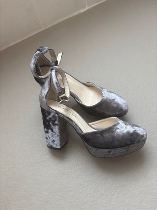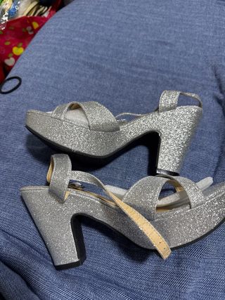 Elegantes zapatos de fiesta con un diseño brillante y moderno. - Acabado plateado con purpurina. - Tira al tobillo con hebilla. - Plataforma delantera. - Tacón grueso.