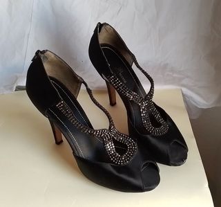 Elegantes zapatos de tacón de Gloria Ortiz, perfectos para eventos especiales. - Material exterior de satén negro. - Adornados con pedrería plateada. - Diseño peep-toe. - Cierre de cremallera en el talón.
