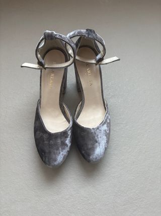 Elegantes zapatos de tacón con detalle de pulsera al tobillo y acabado en terciopelo. - Tacón grueso. - Pulsera ajustable. - Material: Terciopelo.