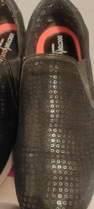 Zapato tipo Bamba Doctor Cutillas negros Num. 40, con suela blanca. En la parte trasera hay un adorno animal print planos. Diseño brillante y elegante. En perfecto estado - Acabado con efecto lentejuelas - Detalle de tira en la parte superior. - Suela blanca. - Adorno animal print marron parte trasera