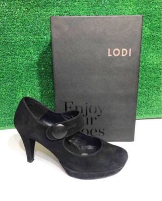 Zapatos de ante (piel) Lodi, color negro, ajuste con correa y clic metálico. Talla 37. Con algún uso pero muy buen estado. Costaron 105 €. Con caja original. Medidas Suela interior 24 cm Tacón 8,5 cm