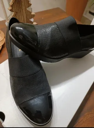 Zapatos de mujer en piel y charol muy elegantes y cómodas con goma elástica para mayor comodidad. Plantilla Goflex. Color negro. Hechas en España Prácticamente sin uso.