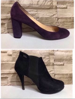 Zapatos Gloria Ortiz, color morado de terciopelo. Talla 41. Tacon 8,5 cm. Suela interior 27 cm. Tienen algo de uso, marcas en el tacon (ultima foto) Botines XTI, color negro, goma elastica en los laterales. Talla 41. Tacon 10,5 cm. Bastante uso. Marcas de uso (ultima foto) Precio lote 6€