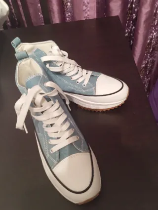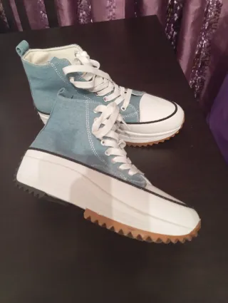Zapatillas de estilo Converse para mujer, con un diseño moderno y juvenil. - Acabado en tejido tejano. - Cierre con cordones blancos. - Suela de plataforma. - Punta reforzada. - Se venden por un problema de mi anchura de pie