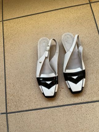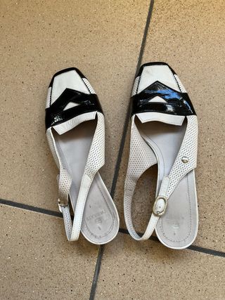Elegantes zapatos de estilo retro con un diseño bicolor. - Combinación de blanco y negro. - Detalle de charol brillante. - Diseño abierto en el talón con tira ajustable. - Suela perforada para mayor transpirabilidad.