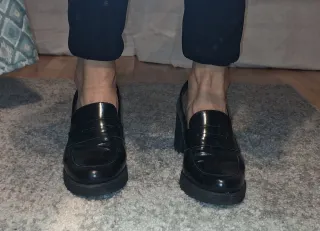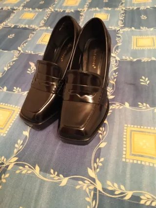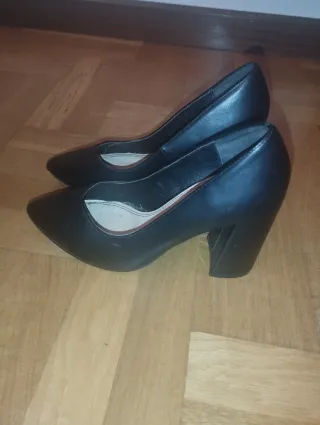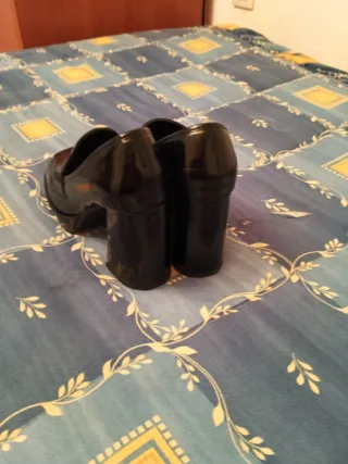 Elegantes zapatos de tacón con un diseño clásico. - Tacón grueso para mayor comodidad. - Acabado brillante. - Diseño tipo mocasín. - Ligero desgaste en el talón (foto).