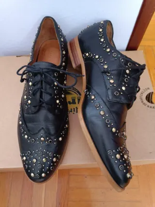 Zapatos negros para mujer, adornados con tachuelas plateadas. - Diseño tipo Oxford - Cierre con cordones. - Marca: Zara Woman.