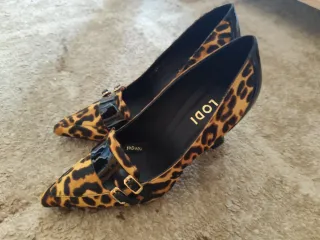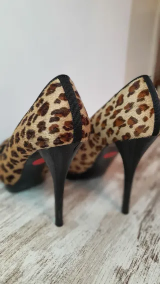 Elegantes zapatos de tacón con estampado de leopardo. - Diseño de pelo. - Tira negra en el borde. - Tacón fino y alto.