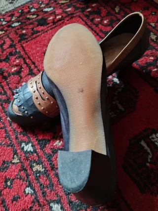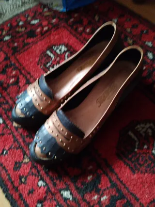 Elegantes zapatos de piel para mujer. - Diseño bicolor en negro y marrón. - Adornados con tachuelas. - Talla 38. Tacón 5 cm