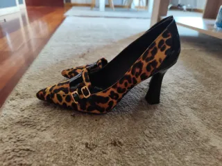 Elegantes zapatos de tacón con un llamativo estampado animal. - Diseño de punta fina. - Detalle de hebillas y charol. - Tacón de altura media.