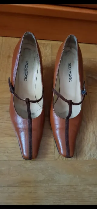 Elegantes zapatos de tacón de la marca Paco Herrero. - Destacar por la parte interna tiene unas rozaduras, uno de los tacones tiene levantada la piel, las punteras están levantadas y necesitan tapas. - Color marrón. - Talla 38. - Diseño con tira. - Punta fina.
