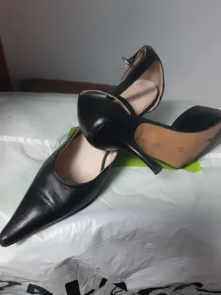 Elegantes zapatos de piel en color negro. Cuentan con un diseño moderno y detalles que los hacen únicos. - Material: Piel. - Cierre con hebilla dorada. - Diseño de punta fina. - Costuras decorativas en la parte delantera. Tacón nuy bajito que los hace super cómodos. Puestos 3 o 4 veces ( solo se nota en la suela)