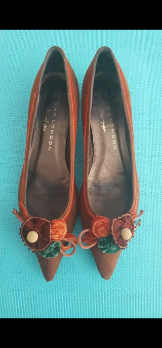 Elegantes zapatos de Sacha London con un diseño único. - Destacar las punteras están levantadas ver últimas fotos. - Color marrón con detalles en naranja. - Adorno floral en la punta.